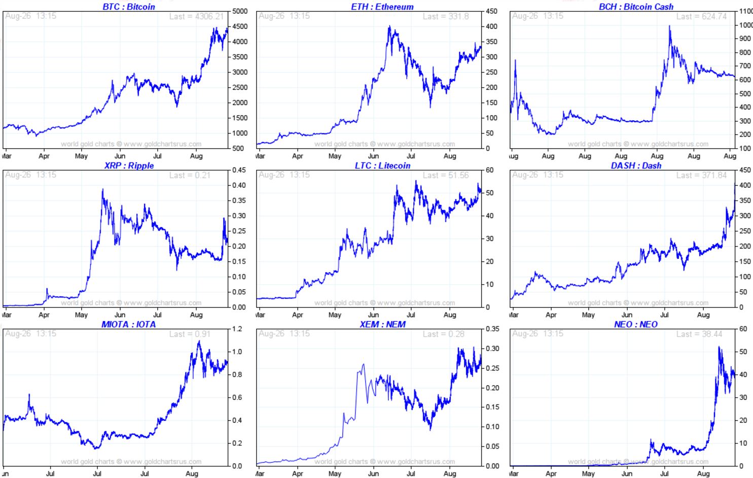 The top 9 cryptocurrencies of 2017, in terms of market cap, are visualized in this one chart. It is a 6-month chart, and it includees the star tof the big rise of altcoins in March of this year.