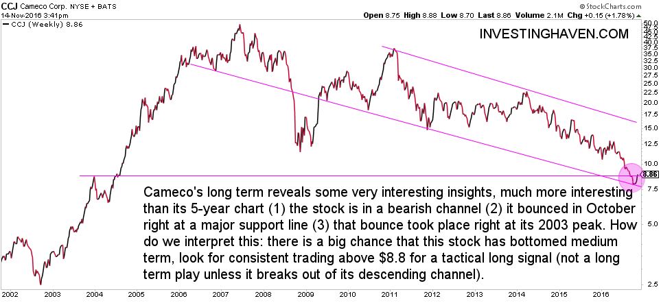 The long term chart of Cameco has some very interesting insights. First, there is a clear channel visible on the chart (connecting the peaks and bottoms since 2006). The stock sits right at major support at this point within that trend channel. Furthermore, there is a second strong support line which comes in at $8.8 (the peak of 2003). This suggests that the stock price is likely to go higher from here, at least short to medium term, unless it breaks below major support at the downside (around $7.5).