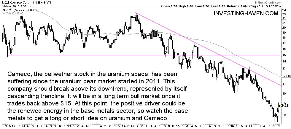 Combining the insights from both charts would bring us to the conclusion that Cameco trades at major support at this point, hinting at a medium-term bottom. If, and that’s a big IF, Cameco goes higher from here, in the coming weeks, we will have seen a major bottom (purple circle on the chart above). There is easy upside potential to $11, and, if broken, till $15 where major resistance will hit. A major bull market will start if the stock will break above $15, but we should evaluate at that point given sentiment and broad market conditions.
