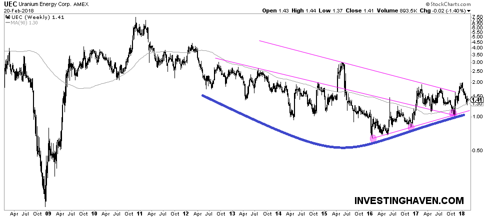 From a price analysis perspective, note the rounding bottom in blue on UEC’s 10 year chart. So far, it is respecting the rising trendline. 1.80 to 2.00 USD is a key resistance area that once broken could lead to a solid move upwards for the price. On the other hand, a sustained drop below 1.10 USD means the price lost the ascending purple trendline.