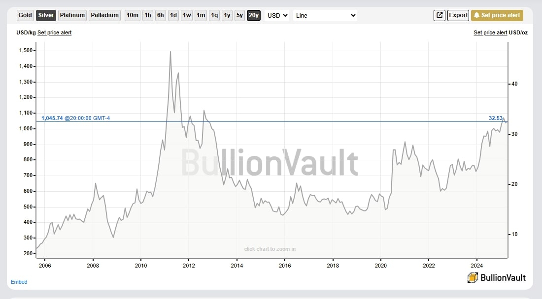 Over the last 16 months, Silver prices have been on a sustained uptrend. And it has culminated with a climb back above $30, after the precious metal reached the current peak of $34.4, for the first time in 13 years.