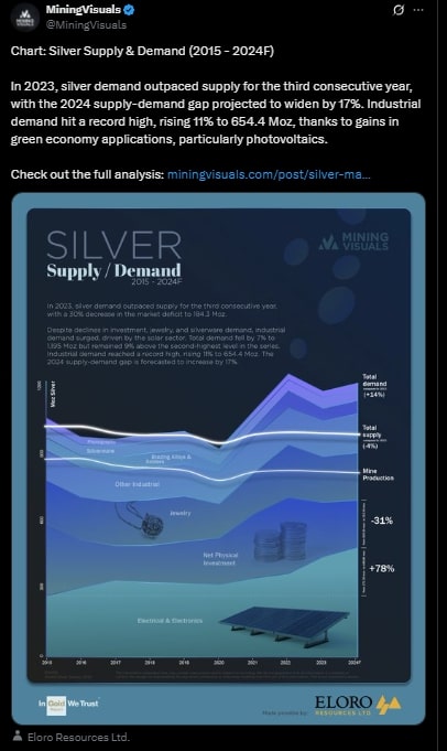 On the other hand, its supply has been on a sustained decline. For four consecutive years, 2020 -2024, the demand for silver has consistently outpaced its supply, and the trend is projected to continue into the foreseeable future.