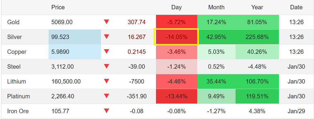 - Silver fell between 8% and 14% from recent highs, marking one of its sharpest daily reversals in years.