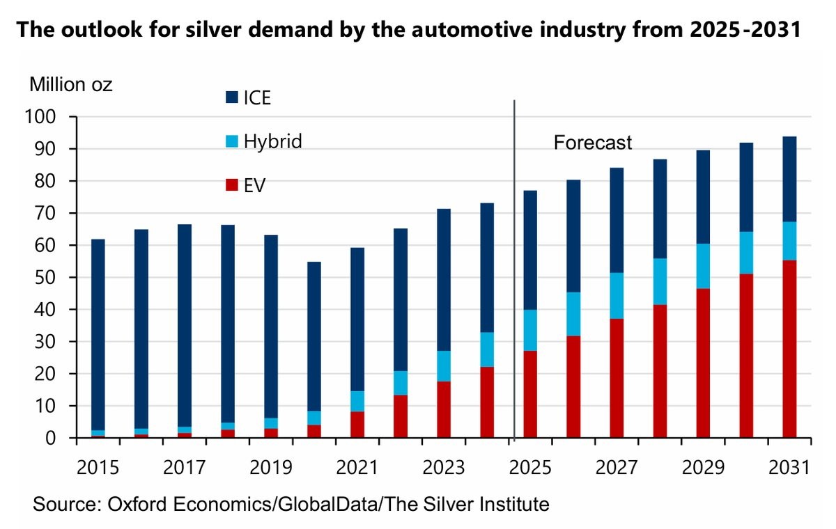 - Each EV uses about 25–50 grams of silver, adding millions of ounces of annual demand.